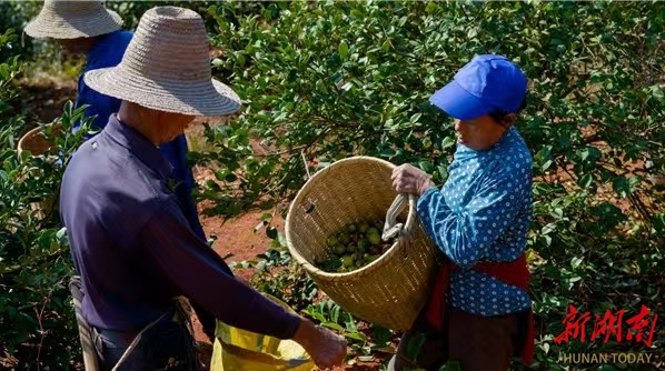 “衡东大桃”良种油茶富百姓。7月下旬,洣水镇鹤祥村油茶种植大户王建国带领村民,每人身上背着一台割灌机来到油茶基地,忙着割除油茶林的荆棘和杂草,他们先除草后垦复。“这样利于对油茶林保水增肥壮果。”王建国解释。