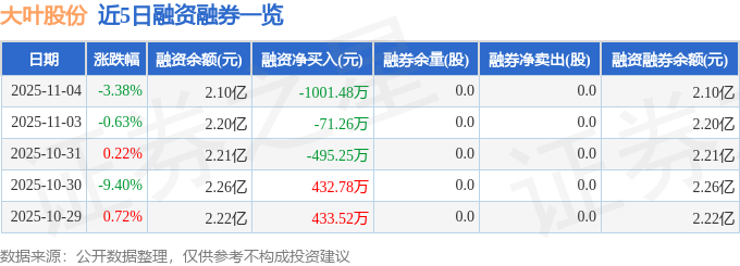 证券之星音讯,到2025年11月4日收盘,大叶股份(300879)报收于30.34元,跌落3.38%,换手率2.57%,成交量5.17万手,成交额1.58亿元。