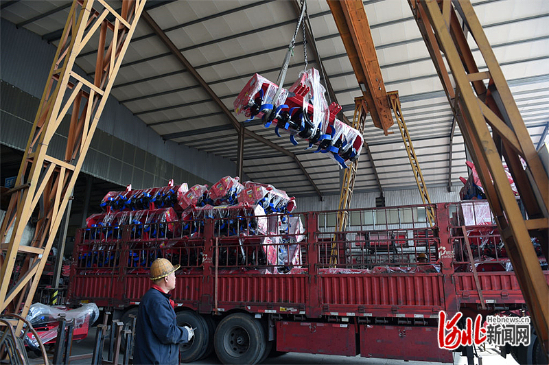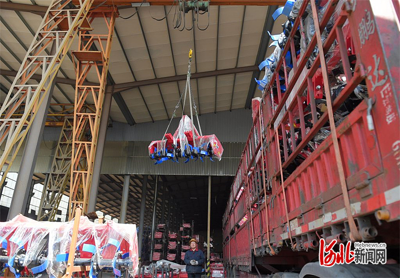 3月22日,河北圣和农业机械有限公司工人在将旋耕机产品装车,供给春耕商场。